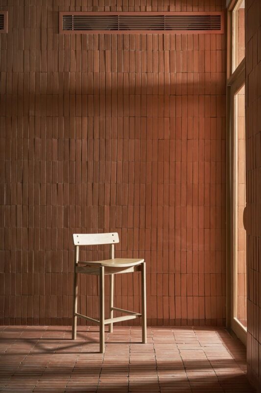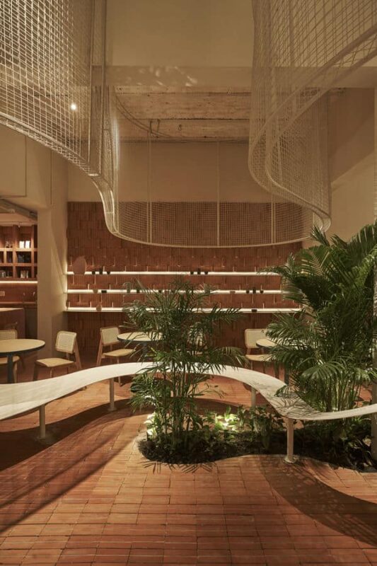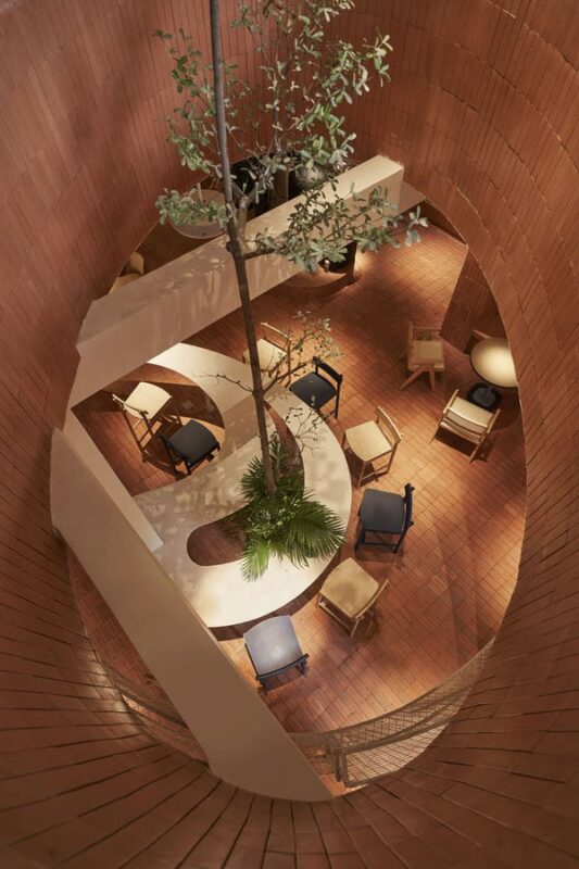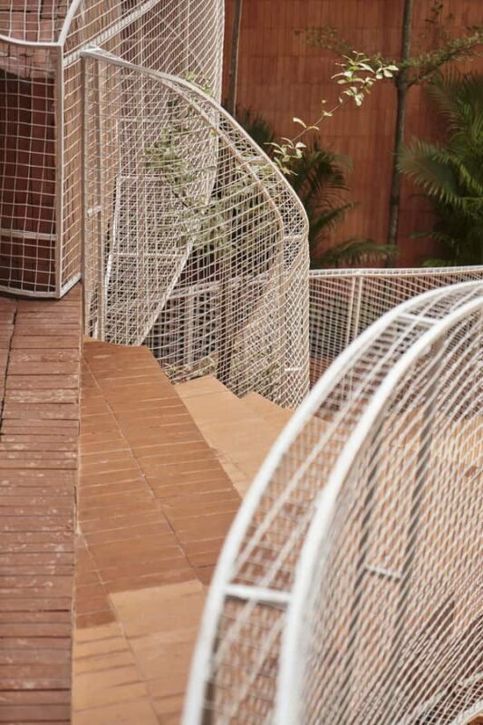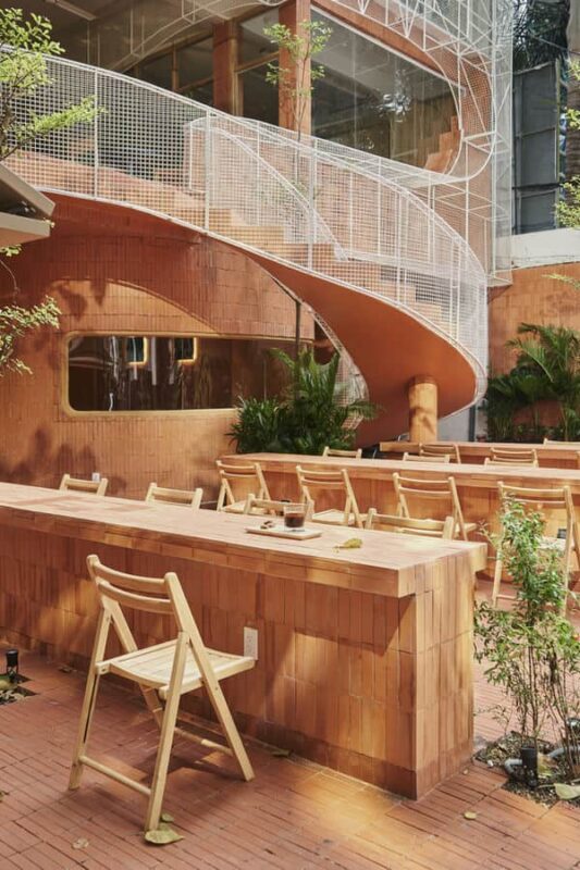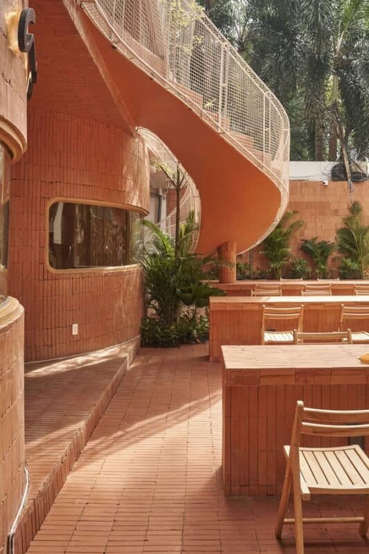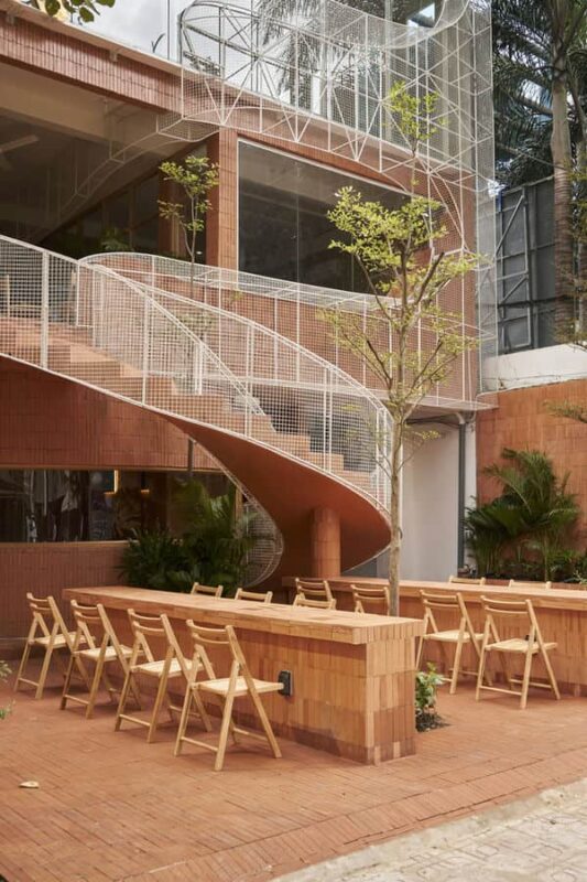 Được dẫn dắt bởi những đường cong từ chiếc bàn sinh hoạt chung lớn ở tầng trệt đến lưới sắt xuyên suốt tòa nhà, kết hợp với những viên gạch đất nung đỏ thẳng tắp, tất cả hòa quyện tạo nên một thánh đường mềm mại .