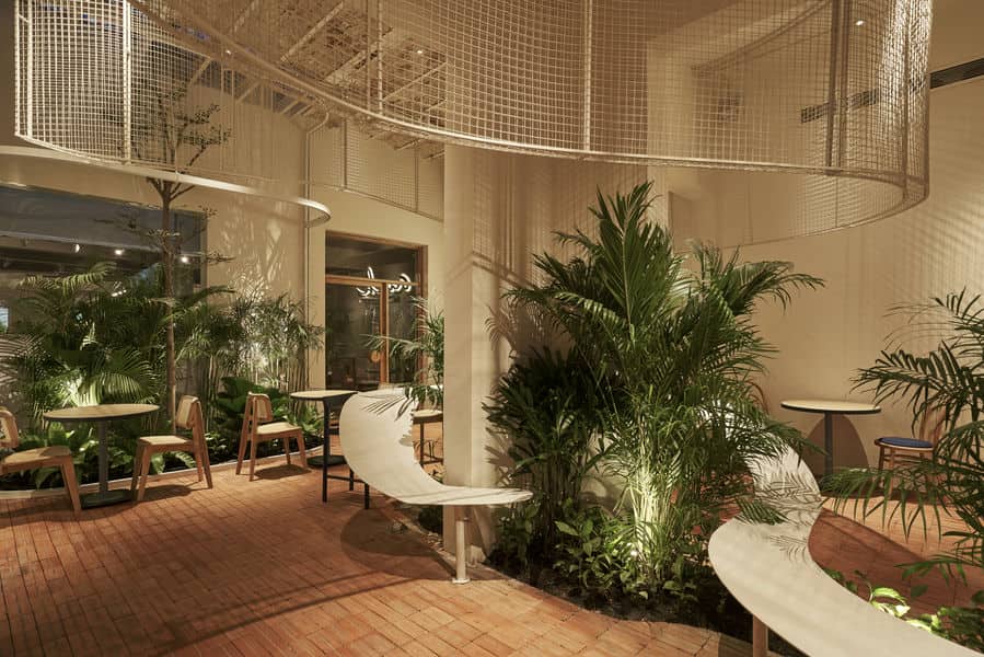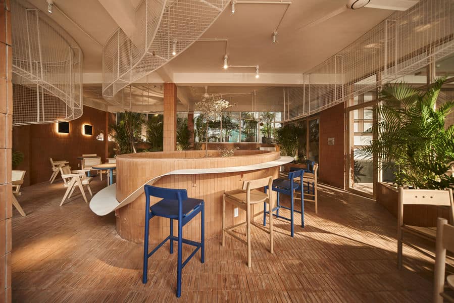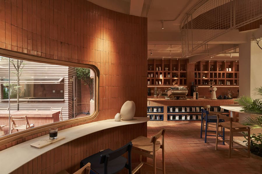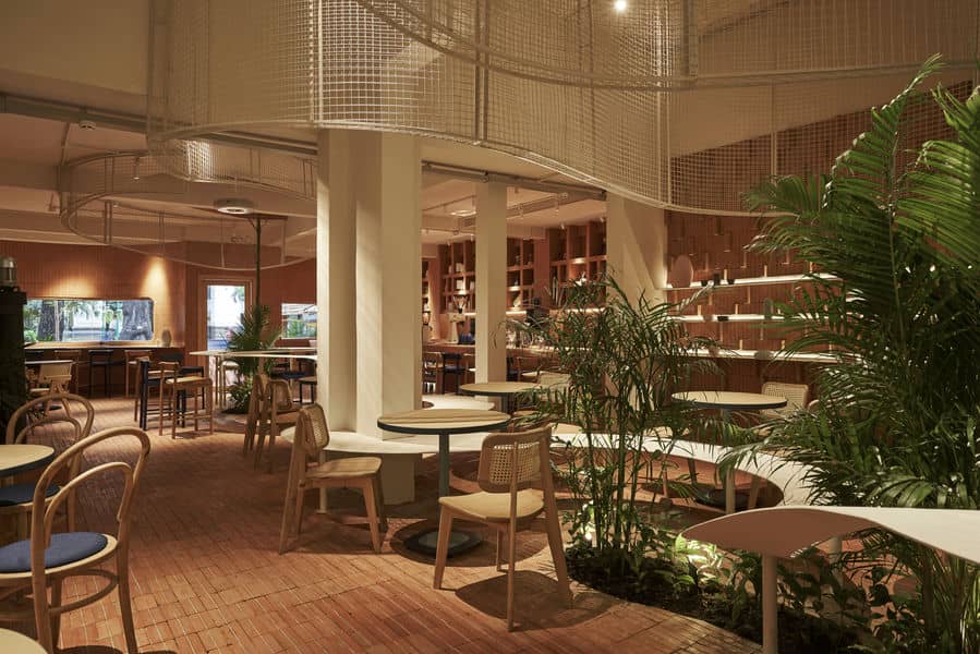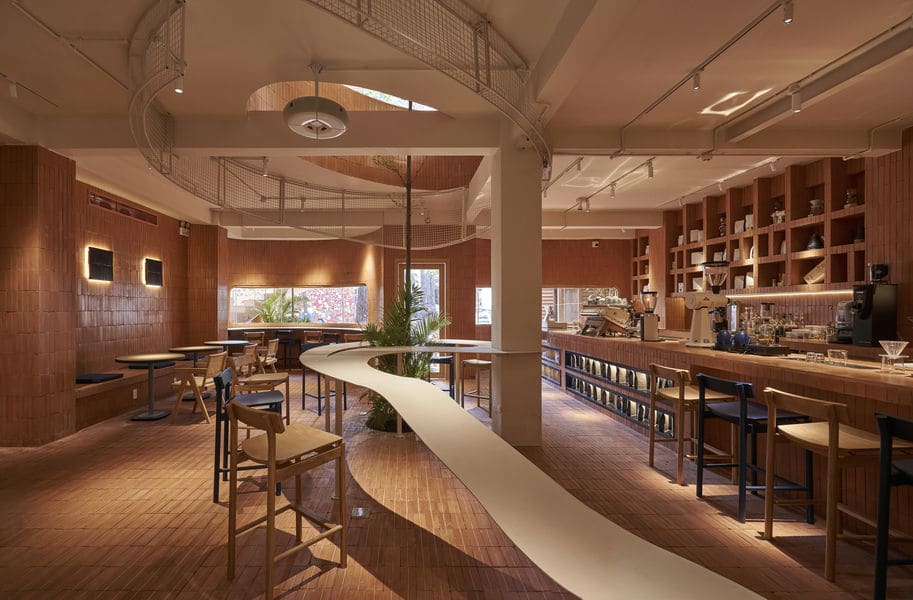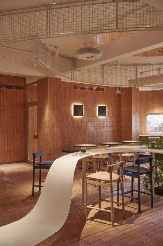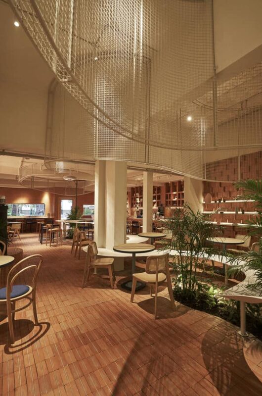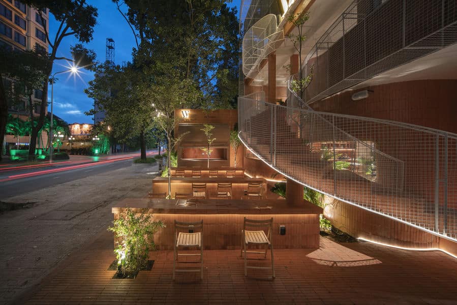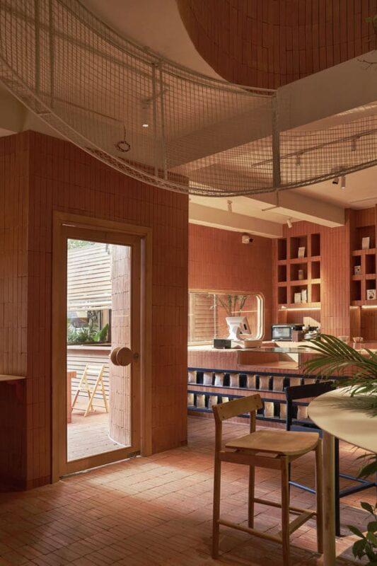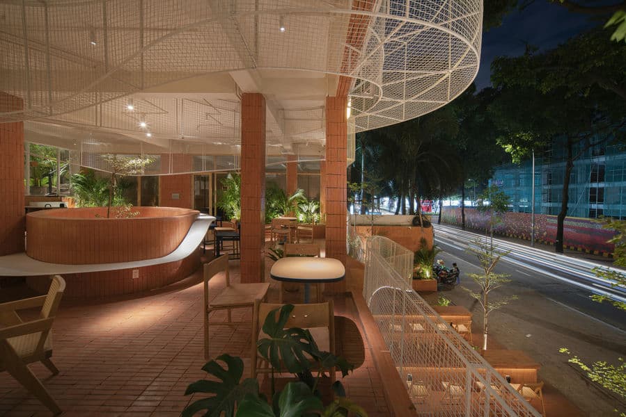 Bằng ngôn ngữ thiết kế và sự kết hợp vật liệu, chúng tôi đưa gạch đất nung đỏ từ mặt tiền vào toàn bộ không gian nội thất – sàn, tường, quầy bar hay thậm chí là khối ghế ngồi. Phần đám mây được thiết kế bằng hệ thống lưới sắt chạy trên trần xuyên suốt cả các tầng và mặt tiền.