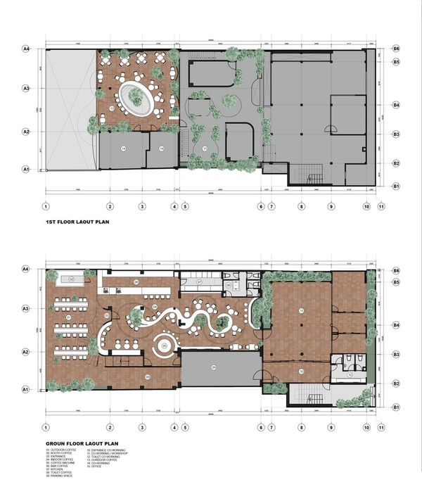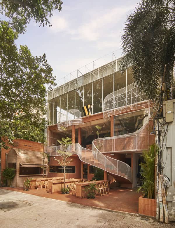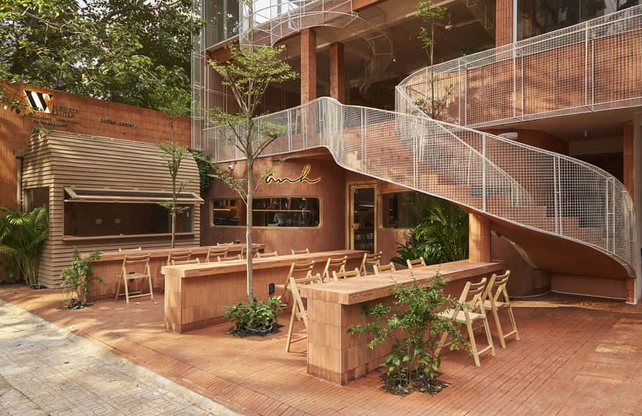 Tạo nên một khối nhà “gạch đỏ” với những đường cong nhẹ nhàng của hệ thống lưới trắng, khó có thể biết hiện trạng chỉ là một khối văn phòng bằng kính cứng nhắc. Sự thay đổi mạnh mẽ về màu sắc, hình dáng, chất liệu có lẽ đã tạo nên điểm nhấn cho “ Anh Coffee Roastery ” ngay từ cái nhìn đầu tiên.