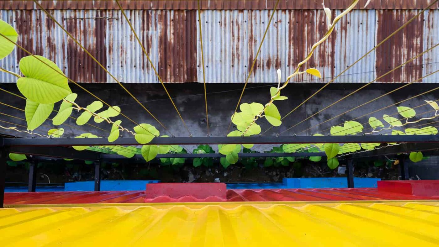 Giàn che phủ xung quanh ký túc xá không chỉ khiến không gian trông xanh hơn mà còn đóng vai trò như lớp da thứ hai bảo vệ khỏi ánh nắng trực tiếp và làm mát không khí bên trong.