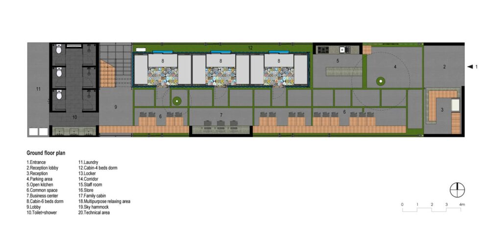 Vì vậy, không gian giường ngủ được giảm thiểu tối thiểu chỉ đủ để ngủ, ngược lại, không gian chung được mở rộng tối đa để tăng sự kết nối giữa du khách, khu vực tắm rửa cũng được chia sẻ.