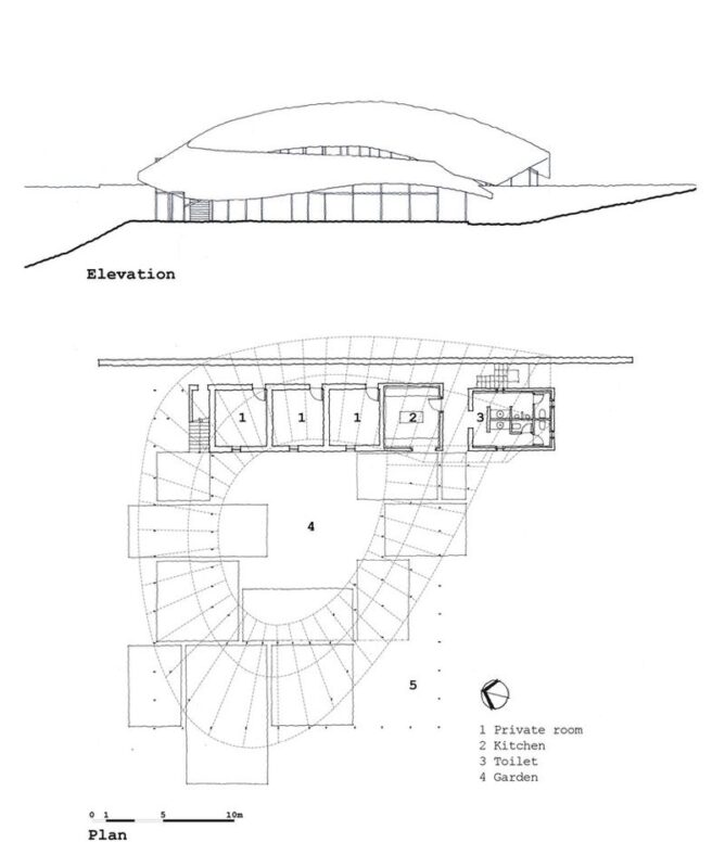 Ấn tượng đầu tiên về quán cà phê là mái tranh cong lạ thường kéo dài từ đường cao tốc xuống tận bờ sông. Mái nhà đơn đó kết nối hai tầng khác nhau thành một và làm mềm đi cấu trúc cứng nhắc hỗ trợ bên dưới. Du khách được dẫn dắt bởi một tuyến đường kỳ lạ từ bên ngoài vào bên trong xung quanh sân được tạo bởi mái vòng.