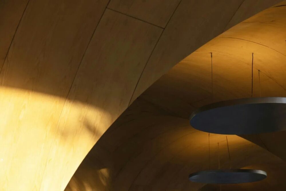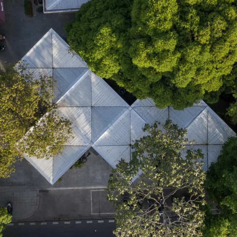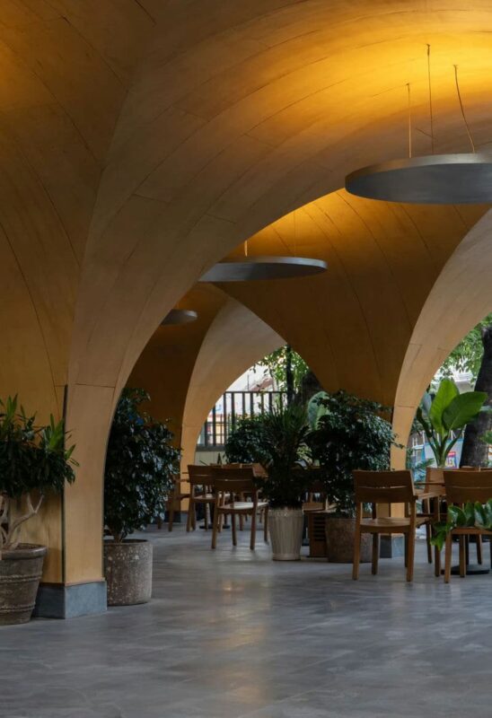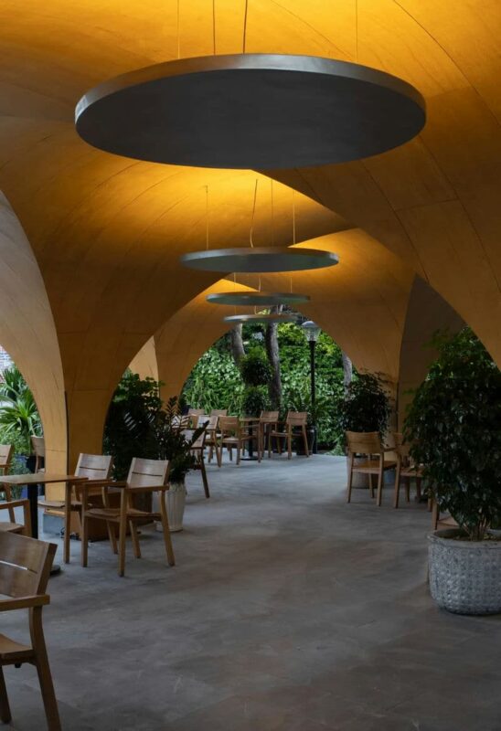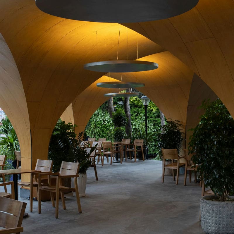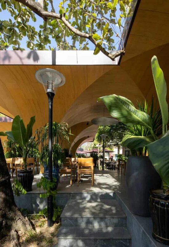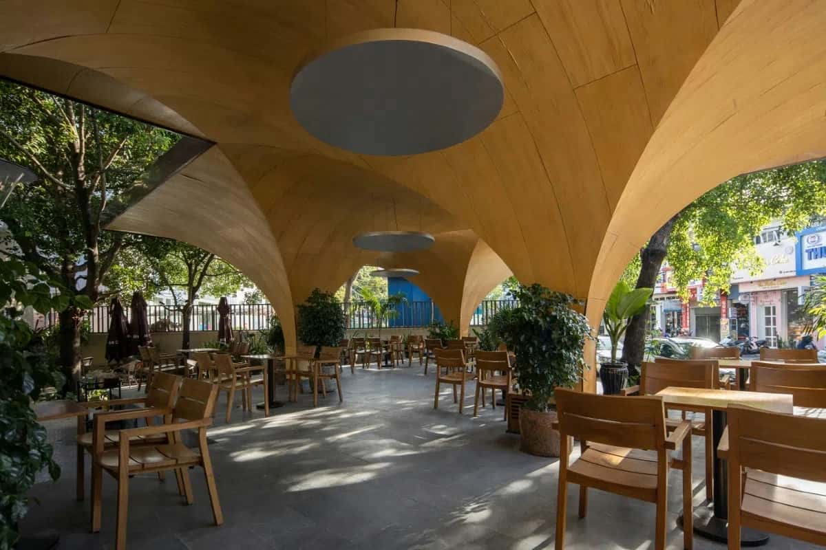 Công trình sử dụng hệ dù mái che bằng hệ khung sắt bao bọc bởi các tấm plywood. Năm module mái dù kết nối với nhau tạo thành không gian cà phê ngoài trời. Điều thú vị là hệ mái này xen kẽ với những cây xanh lâu năm, mang đến một không gian hiện đại, hài hòa với cảnh quan thiên nhiên.