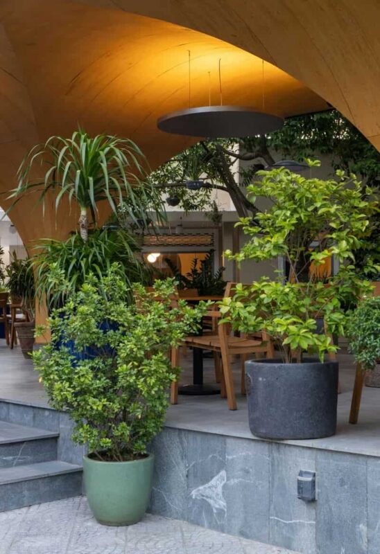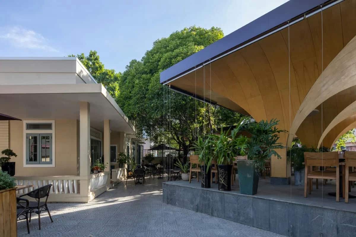 Thiết kế của Sline Coffee hướng đến việc tận dụng tối đa không gian ngoài trời thành không gian mở bên dưới các cây xanh lâu năm được giữ lại.