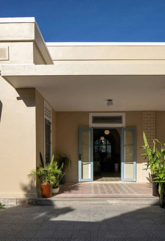 Bên ngoài mặt tiền ngôi nhà là hàng hiên dài. Một vài chi tiết trang trí vốn là nét đặc trưng của lối kiến trúc hiện đại giữa thập niên tại Việt Nam đã được giữ lại. Cửa sổ và cửa đi cũ nay được thay bằng hệ cửa sắt – kính kết nối không gian bên trong và bên ngoài.
