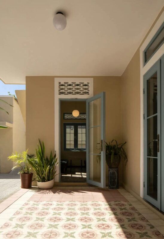 Không gian ngôi nhà cũ trước đây thiếu ánh sáng, thiếu tiện nghi và được ngăn ra bởi nhiều bức tường. Kiến trúc sư thay thế tường chia bằng các lối đi hình vòm, giúp kết nối các không gian với nhau. Đồng thời hài hòa với ngôn ngữ mái cong trong nhà và ngoài trời.