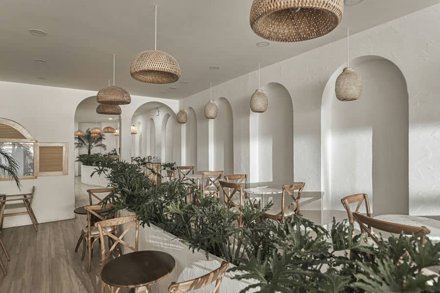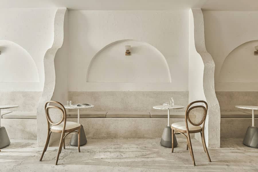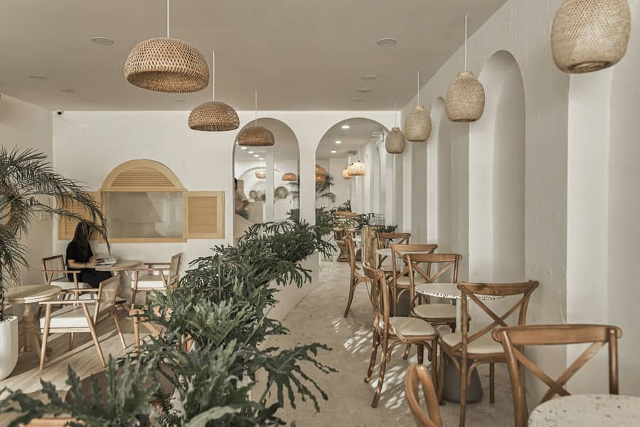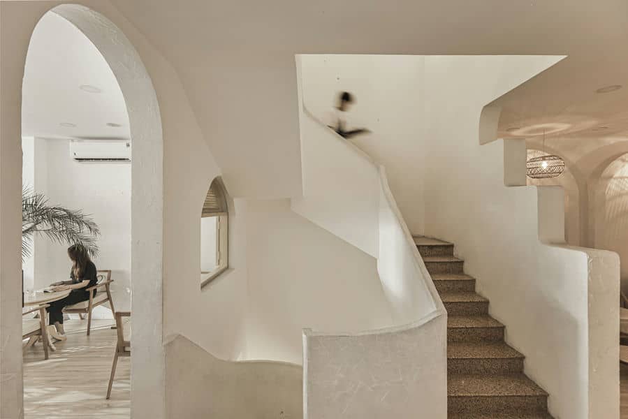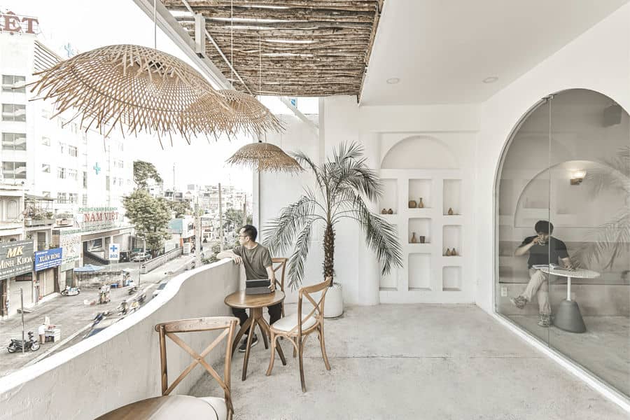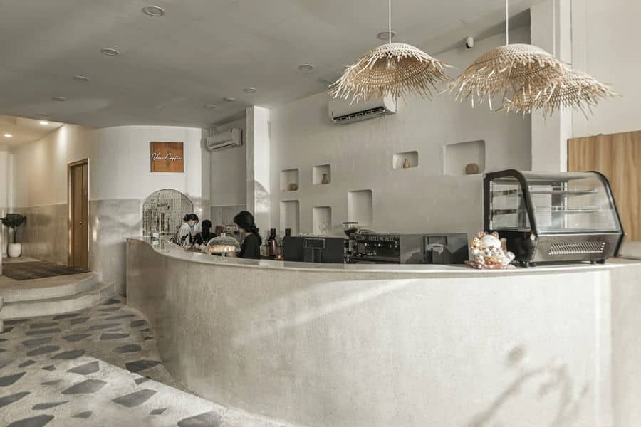 Đầu tiên phải kể đến phần thô được hoàn thiện rõ nét với lối kiến trúc vòm và tone trắng đặc trưng phong cách Coastal. Đúng như cái tên Vòm gợi lên sự uyển chuyển mềm mại, quán có các đường nét kiến trúc gợi cảm nhận rõ ràng về sự thanh lịch.