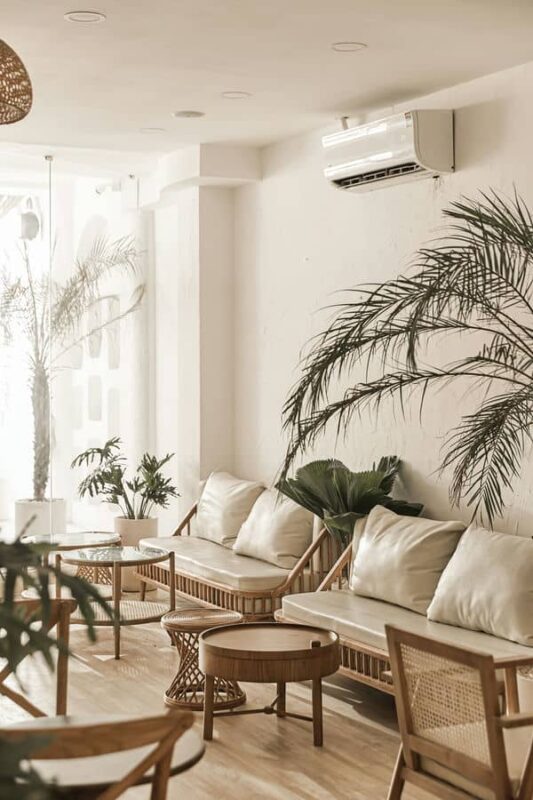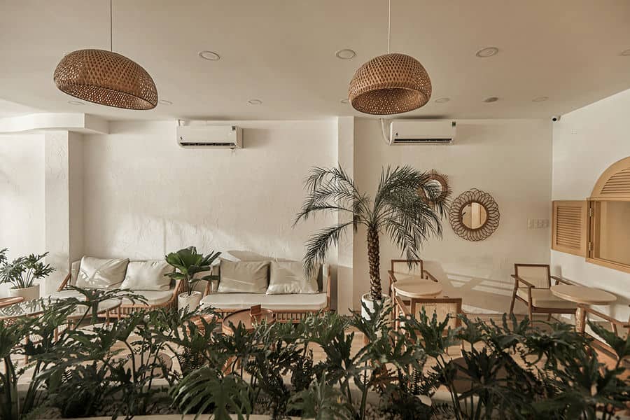 Tông màu chủ đạo là trắng và nâu gỗ, tạo cảm giác ấm cúng và gần gũi. Các chi tiết trang trí như tranh ảnh, đèn lồng, cây xanh… được sử dụng tinh tế, góp phần tạo nên một không gian đẹp mắt và thu hút.